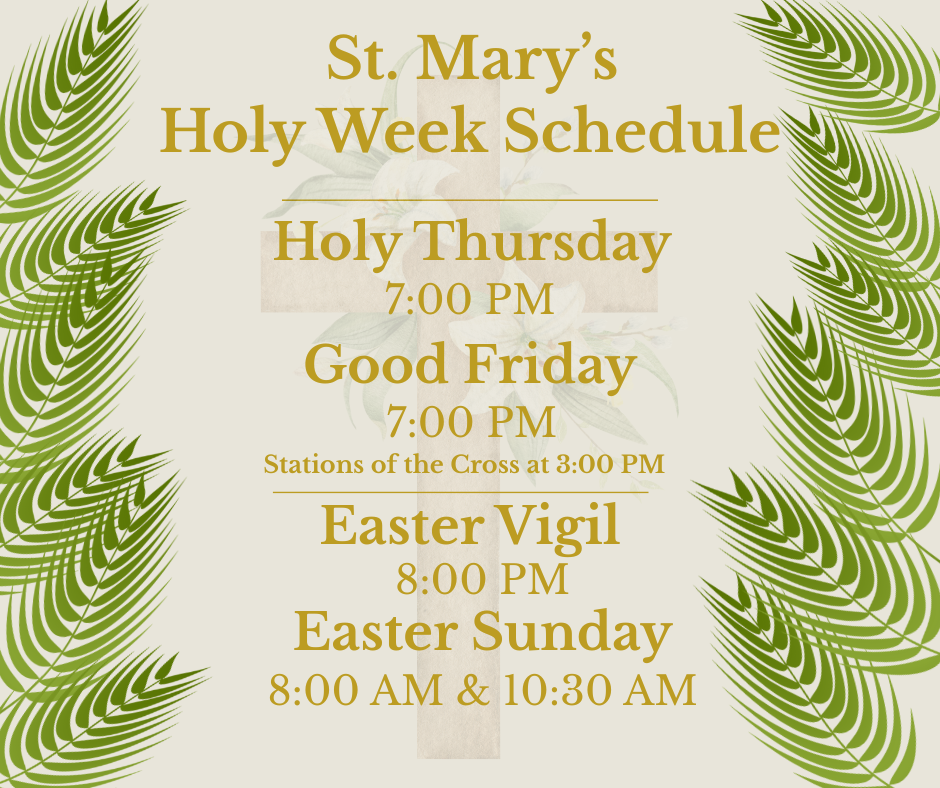 See the attached schedule to find our services and Masses during Holy Week,