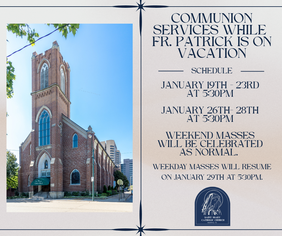 Mass Times Monday - 5:30 PMTuesday (Communion Service), 5:30 pmWednesday - 5:30 PMThursday - 5:30 PMFriday - 5:30 PMSaturday evening - 4:30 PMSunday - 8:00 AM and 10:30 AM Holidays and Holy Days: Please refer to the parish bulletin or call the Parish Office